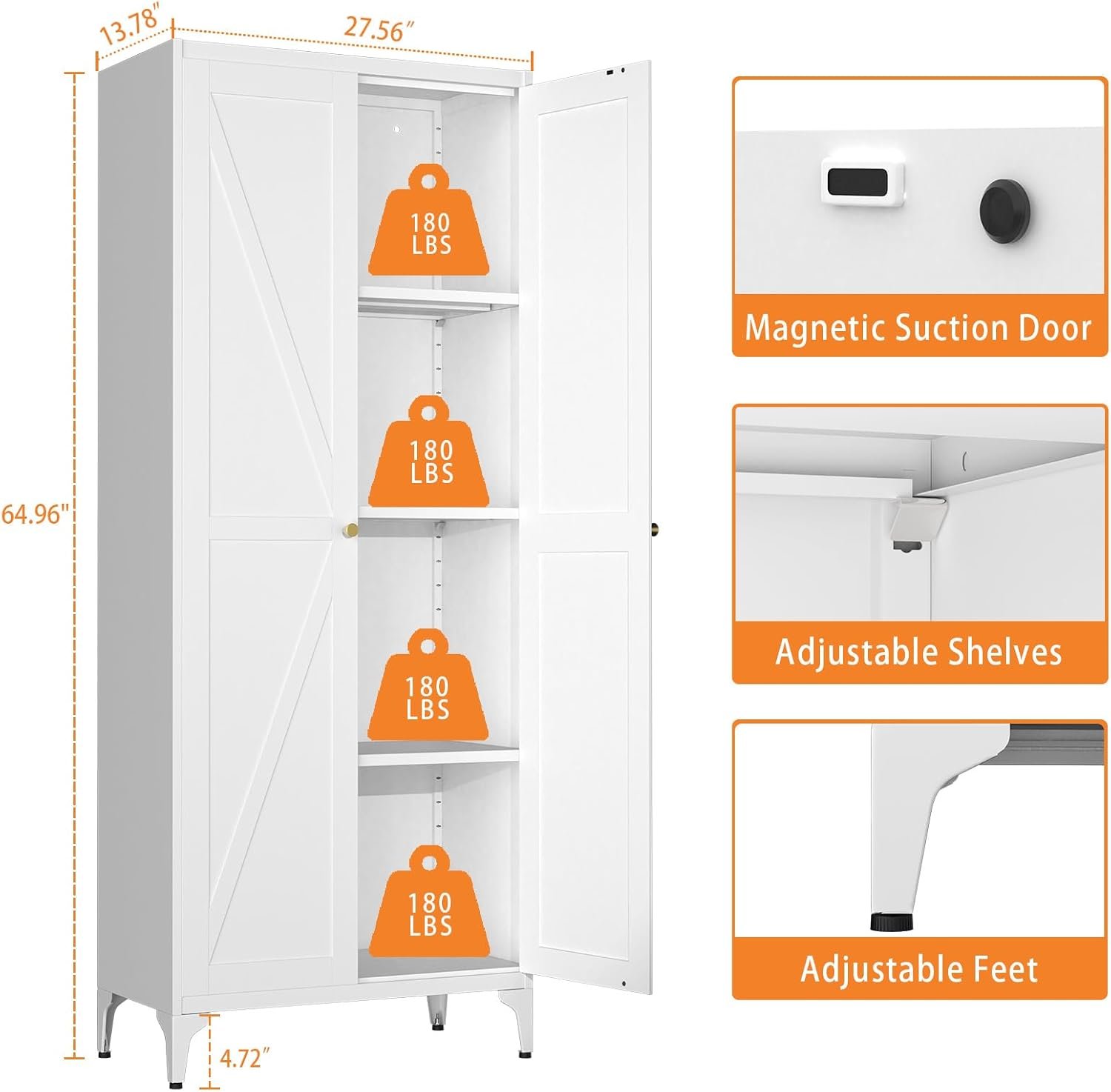 65” Tall Metal Storage Cabinet, Kitchen Pantry Storage Cabinets with Doors and 3 Adjustable Shelves, White Food Pantry Cabinets for Dining Room, Living Room, Office, White